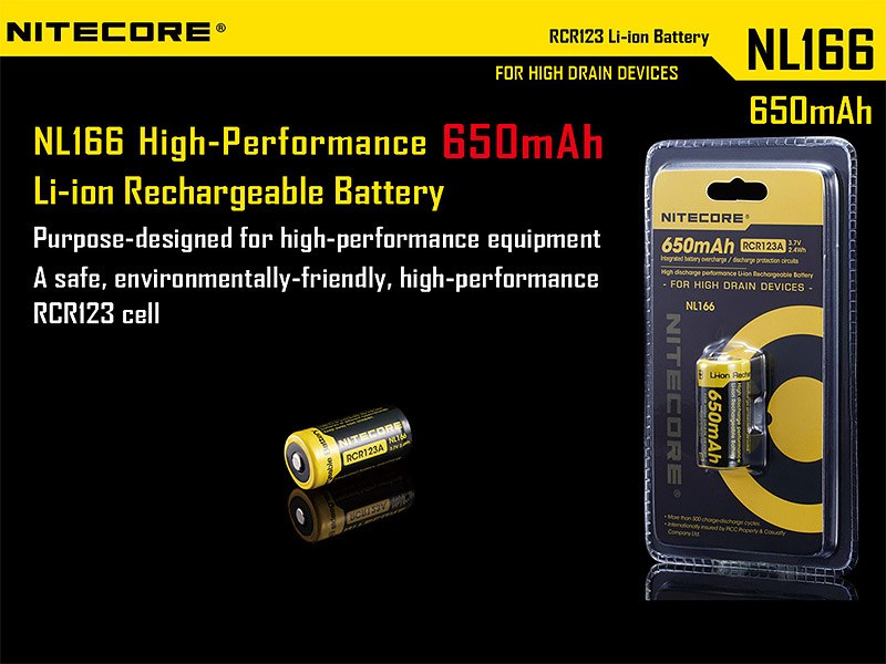 Nitecore est connu pour ses lampes innovantes et ses chargeurs de batterie très performants. Avec la NL166, la marque propose une batterie Lithium rechargeable au format 16340. Cet accu RCR123 d'un voltage de 3.7V et d'une capacité de 650mAh possède plusieurs protections (court-circuit, surchauffe...). Destinée aux appareils ayant besoin de beaucoup de puissance, comme les toutes dernières lampes de poche, la NL166 est une excellente CR123 rechargeable !
